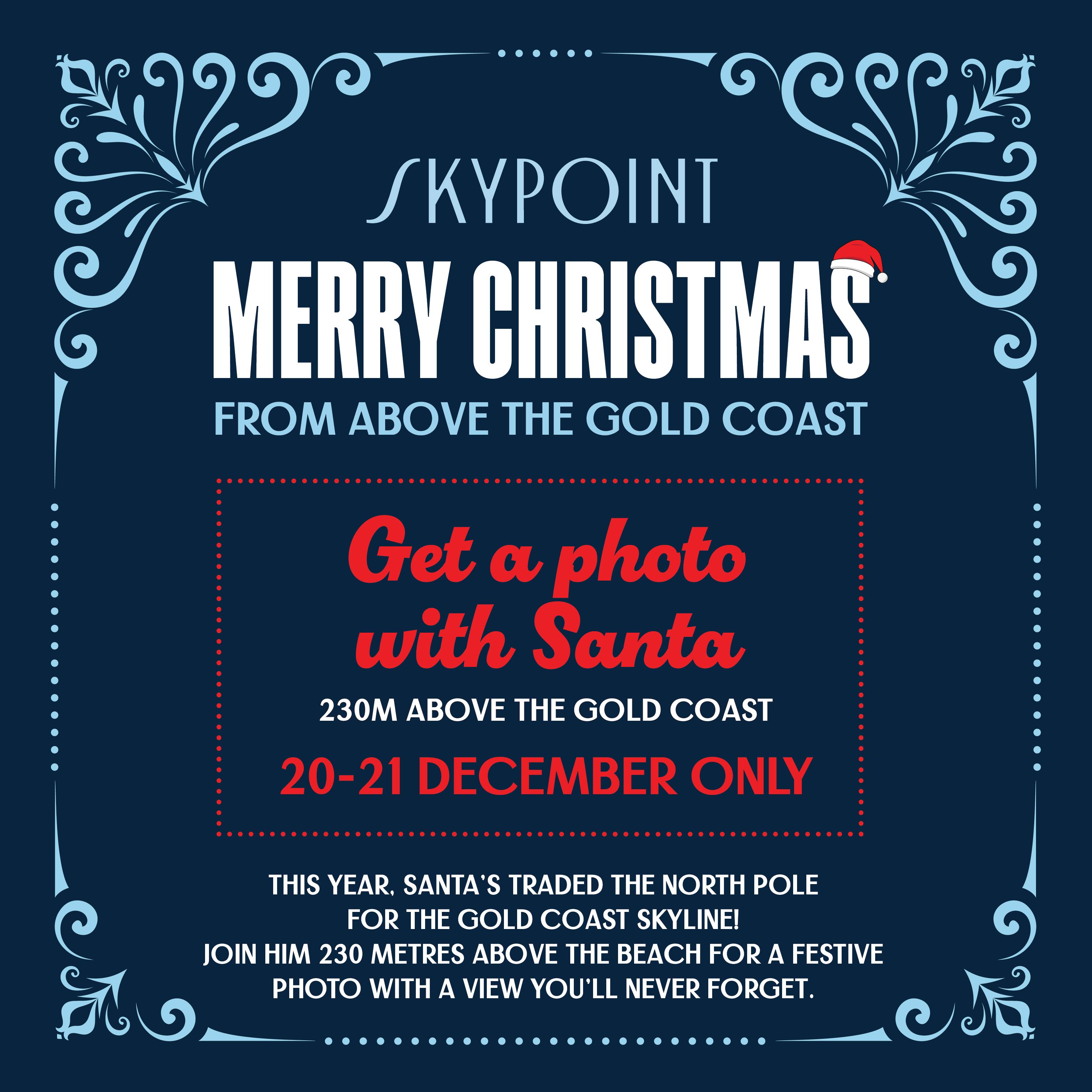 Celebrate Christmas at new heights with Santa and his Elf at SkyPoint. Capture a magical festive photo above the Gold Coast with stunning 360° views. Available Saturday 20th and Sunday 21st December only, with limited sessions — book your spot now and make it a Christmas to remember.